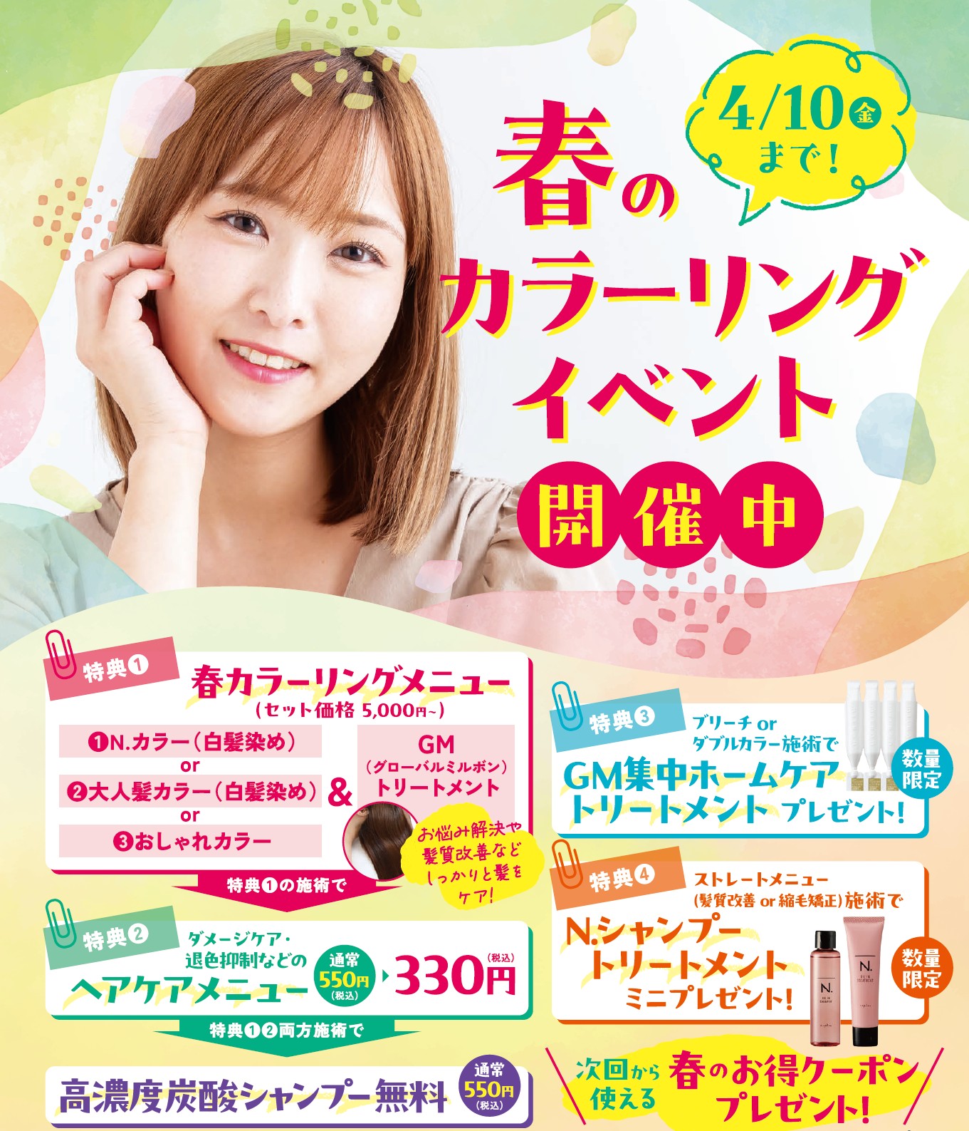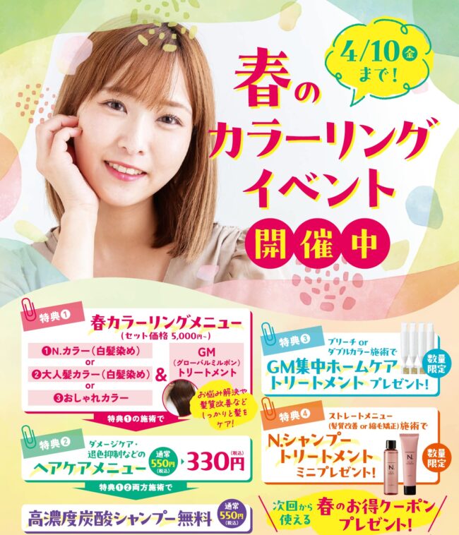 お得な春イベントメニューで、冬の乾燥した季節の髪を