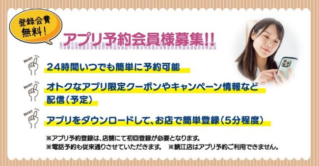 ホーム > PA.ZA.PA. > INFO > 簡単!いつでも!アプリ予約!導入しました 簡単!いつでも!アプリ予約!導入しました メニューを選び⇒担当者を選び⇒時間を選ぶ。 簡単操作で予約ができます。 ※種池店/二の宮店/武生店/森田店/和田東店の5店舗にて、ご利用可能です。 ※アプリ予約会員になる為には、ご利用店舗の来店が、一度必要となります。 キャンペーン クーポン