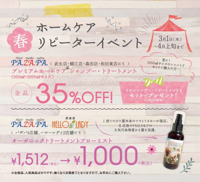 ホーム > PA.ZA.PA. > INFO > 3月1日より ホームケアリピーター イベント開催★ 3月1日より ホームケアリピーター イベント開催★ 春ホームケアリピーターイベント開催★ 年末大好評だった、ホームケアシャンプー・トリートメントがまたまたスペシャル割引特価にて限定販売致します! キャンペーン クーポン